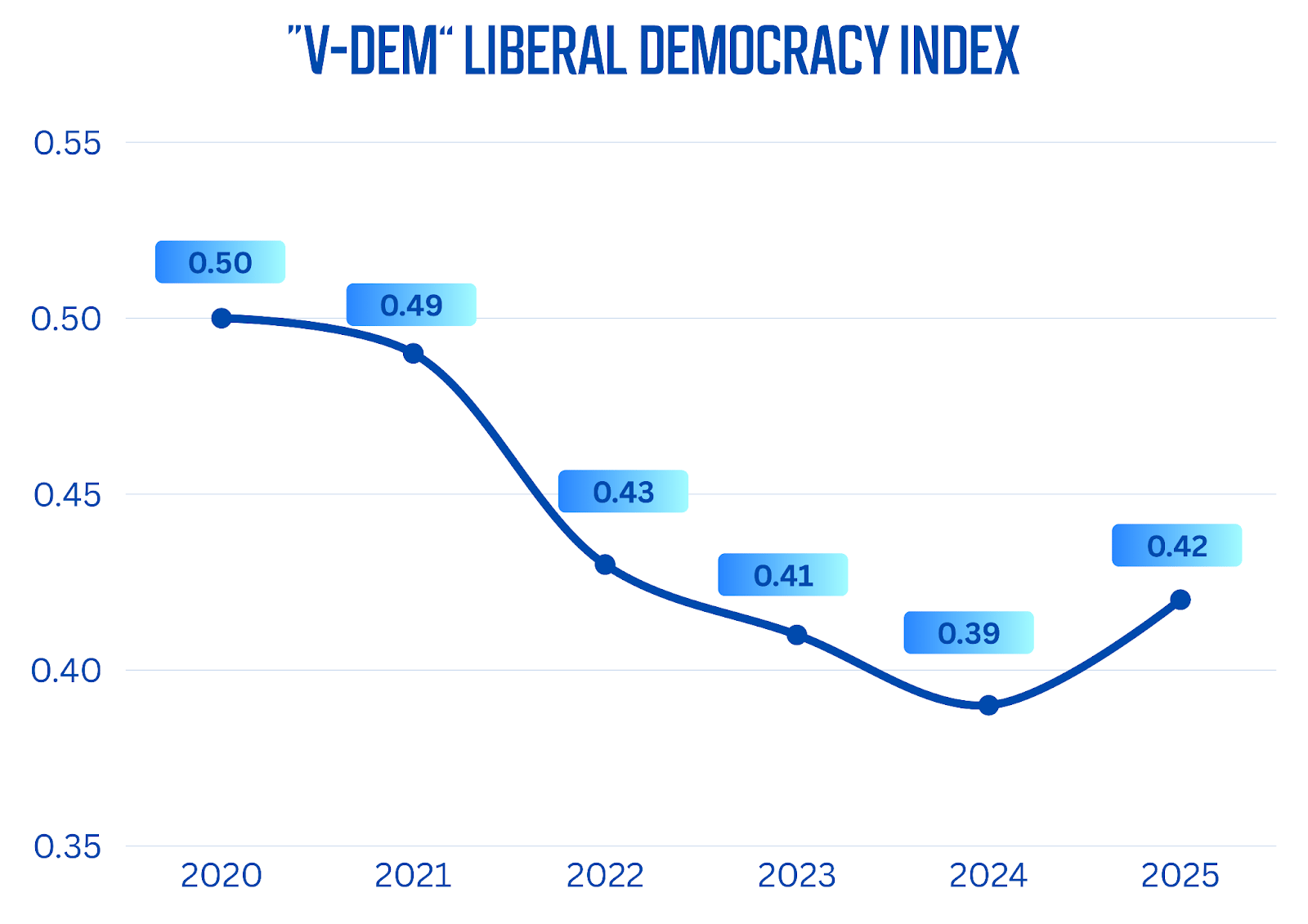 🖊️Монгол улсын хувьд ардчиллын индексийн оноо сүүлийн 5 жил тасралтгүй буурч 2024 оны байдлаар 0.39 оноотойгоор “electoral autocracy” ангилал руу унасан бөгөөд V-Dem-ийн мэдээллээр энэ ангилалд орсон улсууд нь “Сонгуулийн ардчилал” буюу “electoral democracy”-ийн хамгийн анхдагч шаардлагыг хангахгүй болсон гэж дүгнэсэн юм. Тэгвэл 2025 онд манай улсын оноо 0.42 болж “Electoral democracy” ангилал руу оржээ.