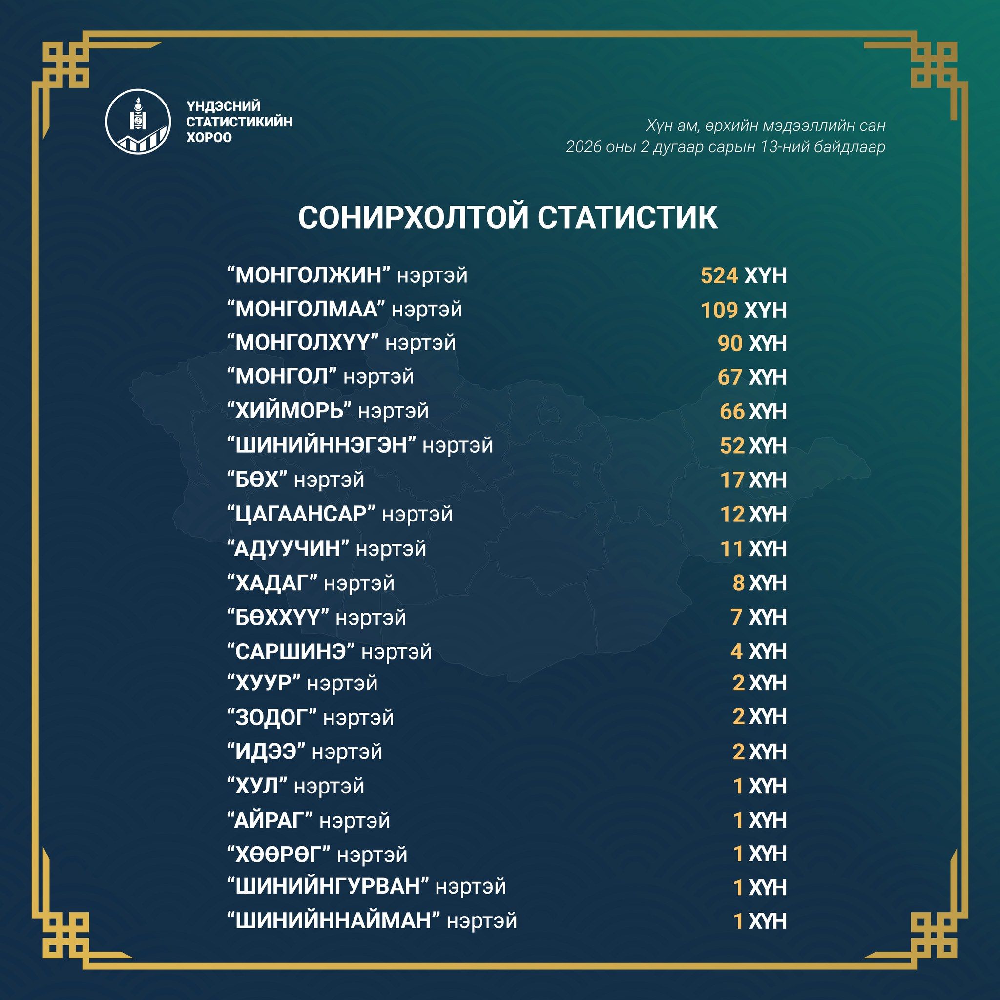 💯Харин сонирхолтой, тэр дундаа сар шинийн баяртай холбогдох дараах нэрс байна. Цагаансар нэртэй 12 хүн, Саршинэ нэртэй 4 хүн, Хөөрөг нэртэй 1 хүн, Шинийннэгэн нэртэй 52 хүн байгаа бол Бэлэг хэмээх нэртэй 20 хүн байна. 🤓